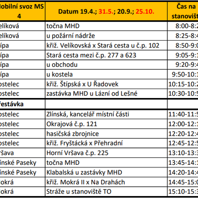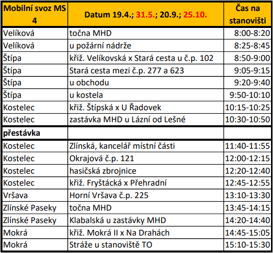 V sobotu 25. 10. nás čeká další kolo mobilních svozů. Vozy Technických služeb Zlín tentokrát přijedou do Velíkové, Štípy, Kostelce, na Vršavu, Zlínské paseky a na Mokrou. V tomto termínu bude také možné odevzdat nebezpečný odpad. Bioodpad lze odložit do kontejnerů ve Lhotce, Malenovicích a na Salaši v čase od 8 do 12 hodin.